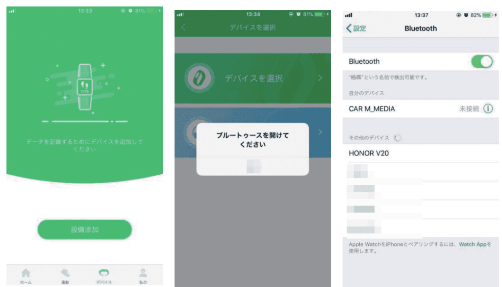 その後、設備の追加 > デバイスを選択 の順番にクリックすると、スマートウォッチH2が表示されるのでクリックすると、同期が完了となります。